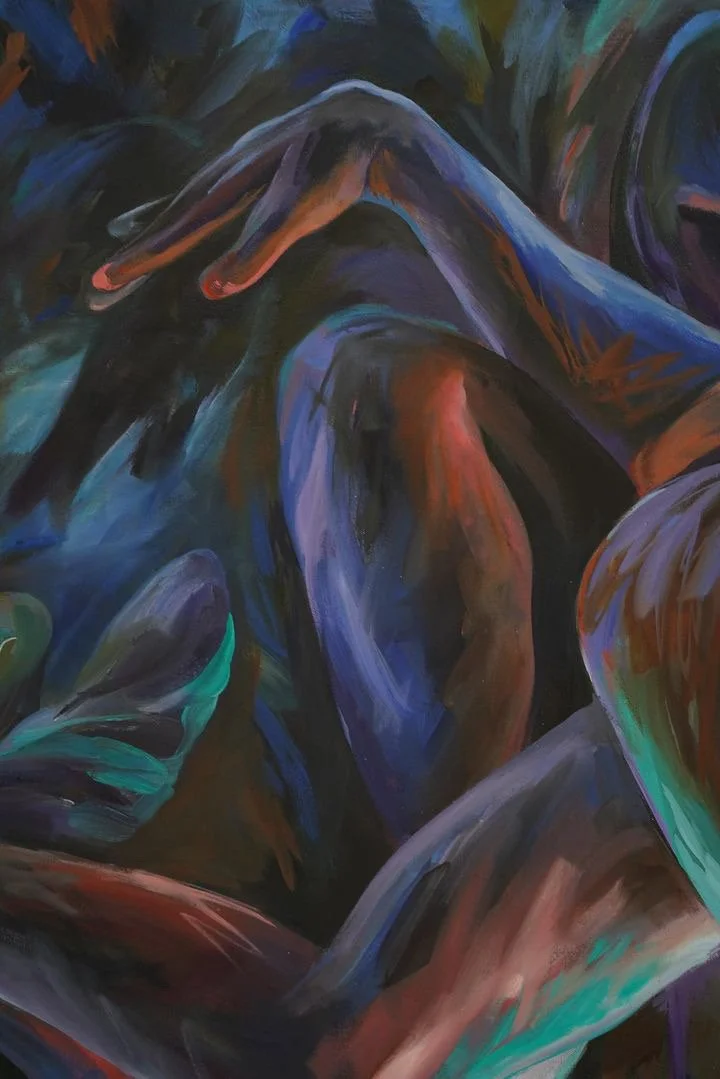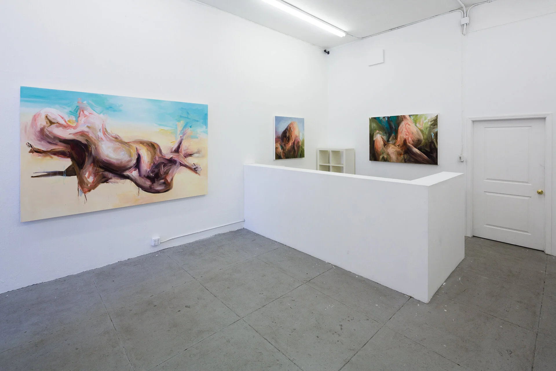 In this series of work, Broersma mines her own personal history for the moments that shaped her perception of what was and wasn’t appropriate about the body. Fleshy forms twist and contort themselves into impossible arrangements, suggesting the lengths we go to in order to satisfy the expectations of others. In both literal and figurative terms, she considers the trophies she received and the aspects of herself they awarded. Then addressing the flip-side, several works in the show imply figures hiding their actions in tangled landscapes by moonlight. Ideas of reward, shame, presentation and taboos meander throughout the paintings, delving into what is showcased and what is hidden.
